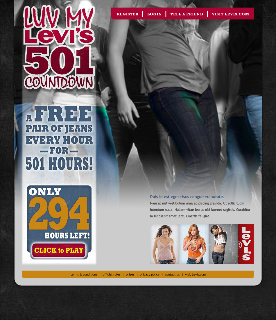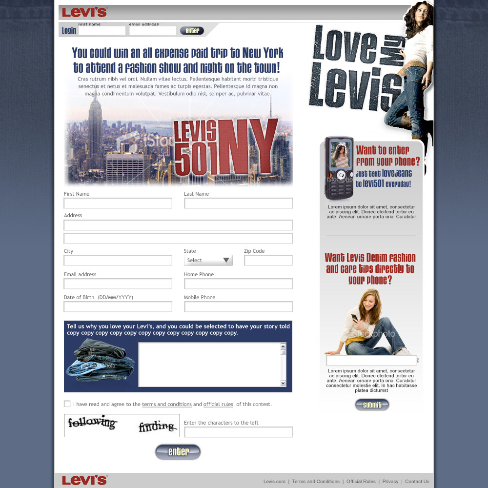 Simple Levis sweepstakes project promoting a new series of the famous 501, and offering sweepstakes entries in return for customer info.